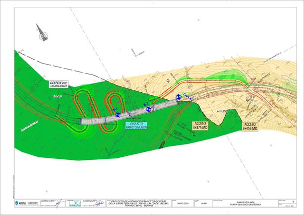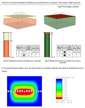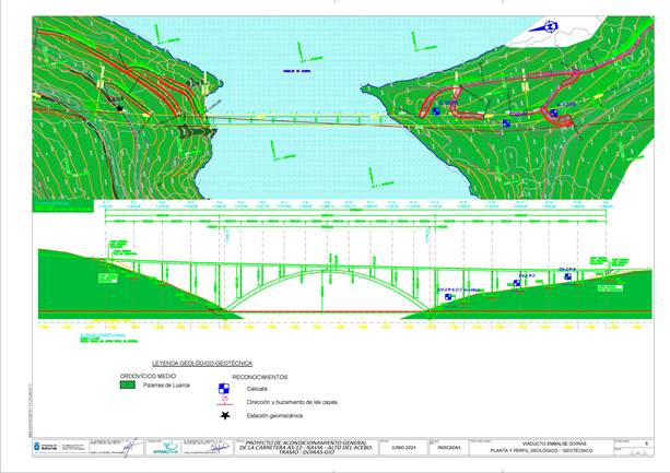 Además, se realizó un estudio de cimentaciones de las estructuras (3 viaductos y muros de escollera), donde se definen los materiales que se detectan a la cota de apoyo de cada estructura, la capacidad portante del terreno en dichos puntos, y, en su caso, la deformabilidad y estabilidad global. Todos los cálculos se han realizado según EL EUROCÓDIGO 7 (UNE‑EN 1997‑1). Como obra singular este proyecto incluye el VIADUCTO EMBALSE DOIRAS EN ARCO, con una longitud de 440 m., constituido por dos estribos y 19 apoyos, 9 de los cuales se apoyan en el arco.