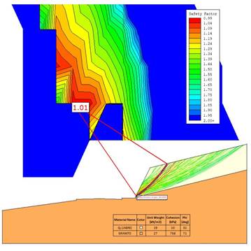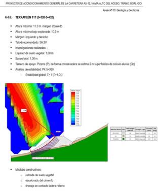 Con esta información se realizó un análisis exhaustivo de la estabilidad global de los taludes de desmontes tanto en roca como en suelos, así como de los rellenos proyectados, que en este caso, debido a la orografía de la zona, discurrirán mayormente a media ladera.